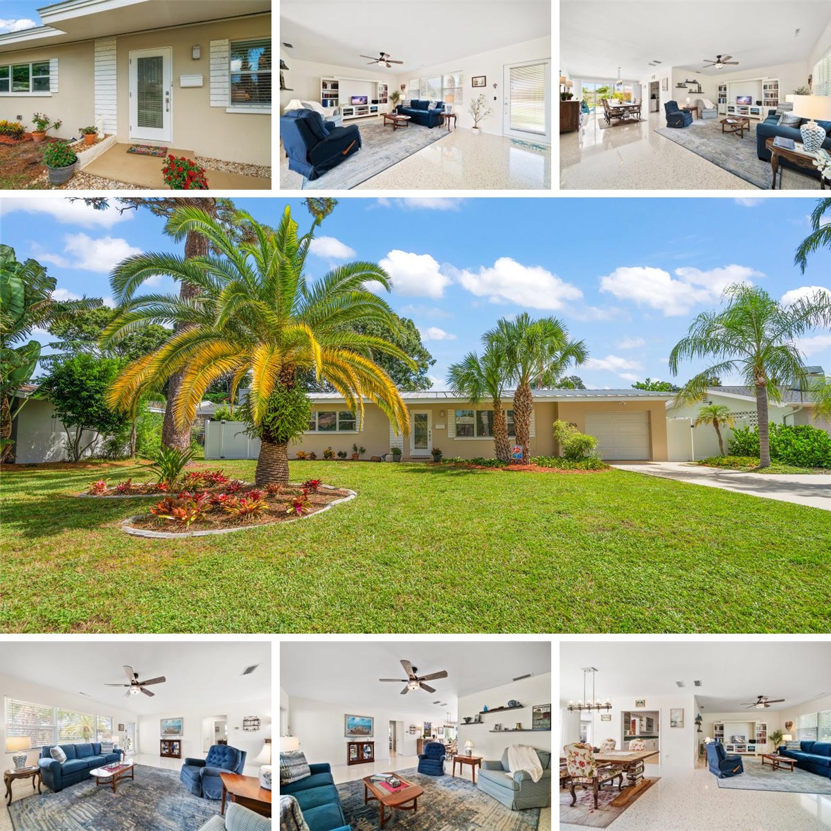 Welcome home! Tucked away on a quiet, seldom-traveled street in the sought-after Town of Belleair, this mid-century modern 2-bedroom, 2 bath home beautifully marries vintage character with modern comfort and convenience. Newly polished terrazzo floors shine under abundant natural light flowing through the spacious family and dining rooms creating an inviting ambiance. Sliders lead to a generous and fenced in private backyard and patio—ideal for gatherings, effortless entertaining, a future pool, or even an addition. A flexible bonus room offers the perfect spot for a home office, craft room or studio. Both bedrooms are light-filled with ample closets, and the baths showcase charming original tile. An indoor laundry with side yard access and a garage with extra storage add convenience to this move-in ready home. Perfectly positioned near boutique shopping, local dining, and world-class beaches, this Belleair treasure is a rare opportunity.